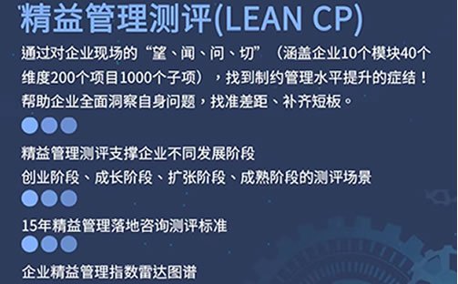 精益管理測(cè)評(píng)系統(tǒng)是基于整個(gè)精益制造模型而發(fā)展的診斷模型,覆蓋客戶全價(jià)值流從供應(yīng)商端到客戶端的精益實(shí)施狀況,通過(guò)測(cè)評(píng)系統(tǒng)使用者能清晰的了解到目前在組織內(nèi)流程的精益狀態(tài),也能了解從現(xiàn)有的狀態(tài)達(dá)到目標(biāo)狀態(tài)的大概步驟和適用工具,從而為制造業(yè)最重要的價(jià)值增值過(guò)程改善提供決策依據(jù);針對(duì)十大科目實(shí)施線上診斷與線下服務(wù),通過(guò)對(duì)企業(yè)現(xiàn)場(chǎng)的“望、聞、問(wèn)、切”(涵蓋企業(yè)10個(gè)模塊,40個(gè)維度,200個(gè)項(xiàng)目及1000個(gè)子項(xiàng)),找到制約管理水平提升的癥結(jié)!